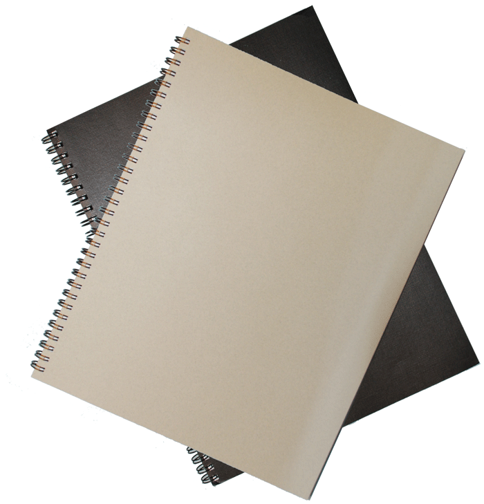 8 1/2" x 11", with eighty sheets of 60 lb paper, wire-o binding and a tongue for smooth insertion into the cover. Choice of black linen or sandstone cover, and gray ruled or blank pages. |